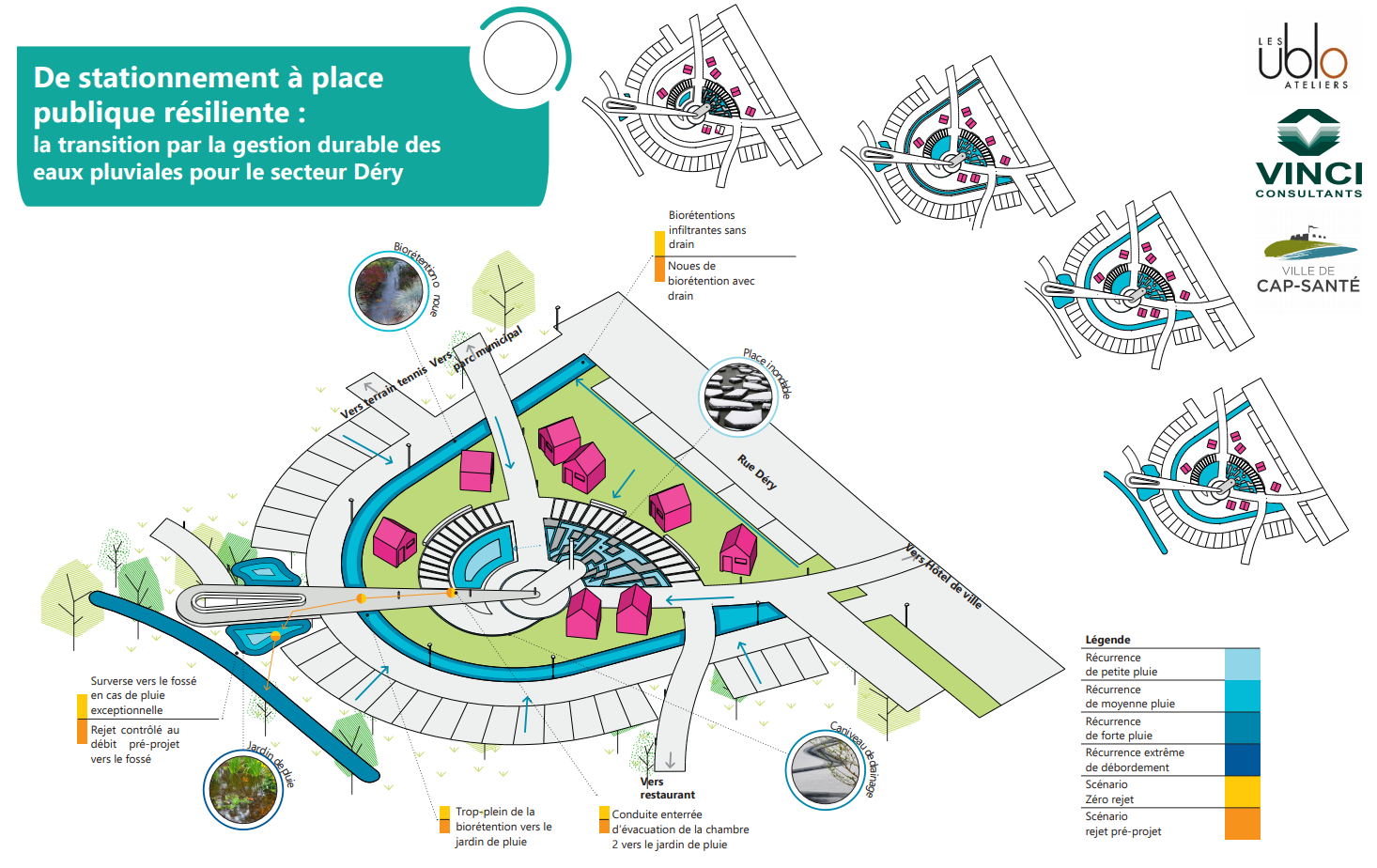 Afin de réaliser cette étude, la municipalité de Cap-Santé a mandaté Les Ateliers Ublo et Vinci Consultants. D’une part, l’équipe de Les Ateliers Ublo se penchera davantage sur la conception générale de l’aménagement à l’échelle micro du Secteur Déry (le contenu) et des processus de planification à développer sur une échelle macro afin de faire évoluer les pratiques durables (le contenant), D’autre part, l’équipe de Vinci Consultants approfondiront davantage le volet central de cette étude, soit la gestion durable des eaux pluviales et l’intégration d’infrastructures vertes.